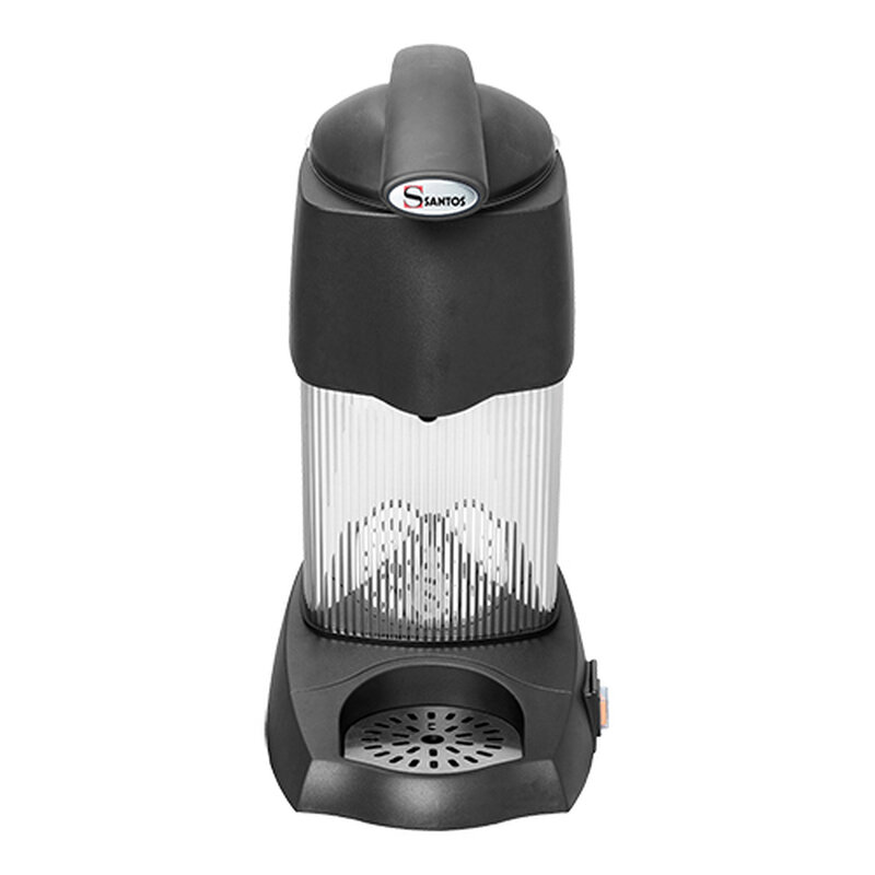 de Santos Evolution haalt d.m.v. middelpunt vliedende kracht de laatste druppel uit gehalveerde sinaasappelen en citroenen, alle pulp blijft achter in de uitneembare centrifugetrommel, veilig: als de hefboom wordt neergedrukt, begint de kegel te draaien, als hij wordt opgetild stopt de Evolution onmiddellijk, de motor is bijzonder stil, eenvoudig te demonteren en daardoor gemakkelijk te reinigen
