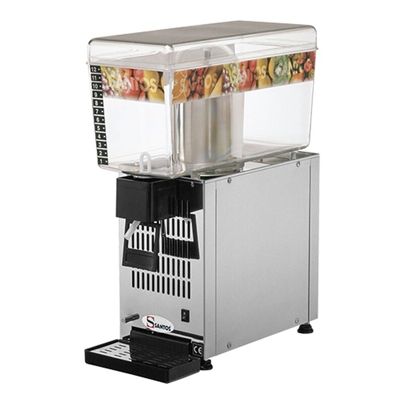 gekoelde drankendispenser voorzien van een onbreekbare voorraadcontainer met maatverdeling, op eenvoudige wijze te demonteren en schoon te maken, de ommanteling is van hoogglanzend roestvrijstaal, uitgerust met een uitschakelbaar roerwerk, automatische thermostaat en lekbak