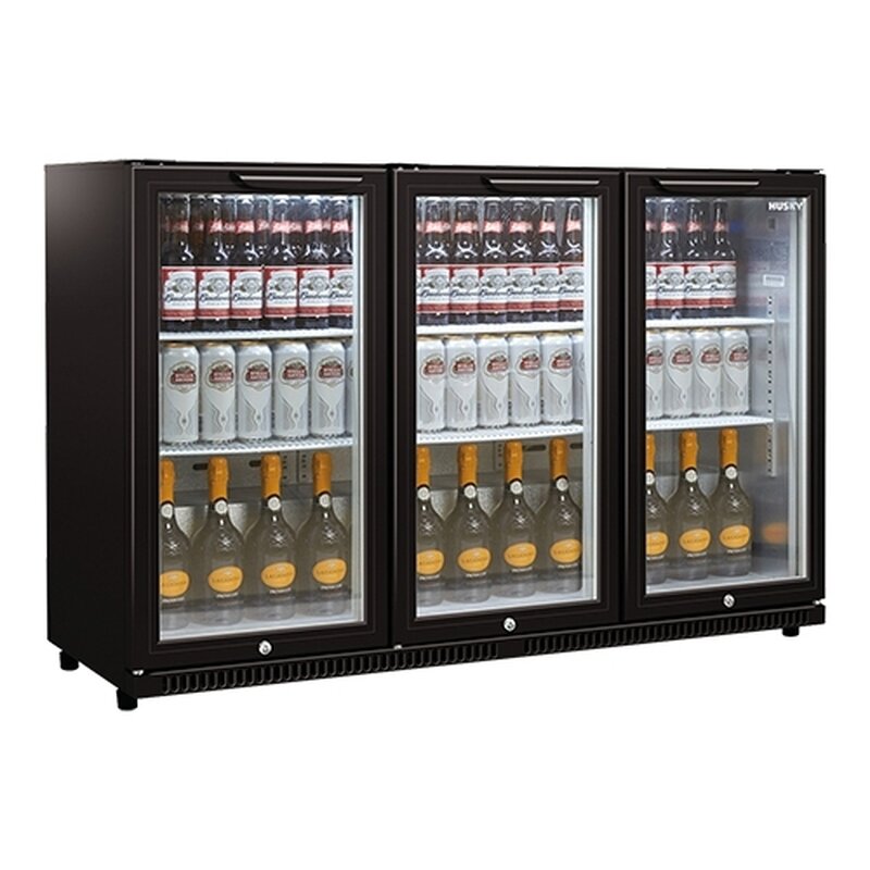 zwart, gemoffeld plaatstaal voor koeling van o.a. flessen en blikjes, temperatuur digitaal instelbaar van +2°C / +10°C, met ventilator voor luchtcirculatie, binnenverlichting en twee verstelbare rekken (35x40cm) per deur, deuren zijn zelf sluitend