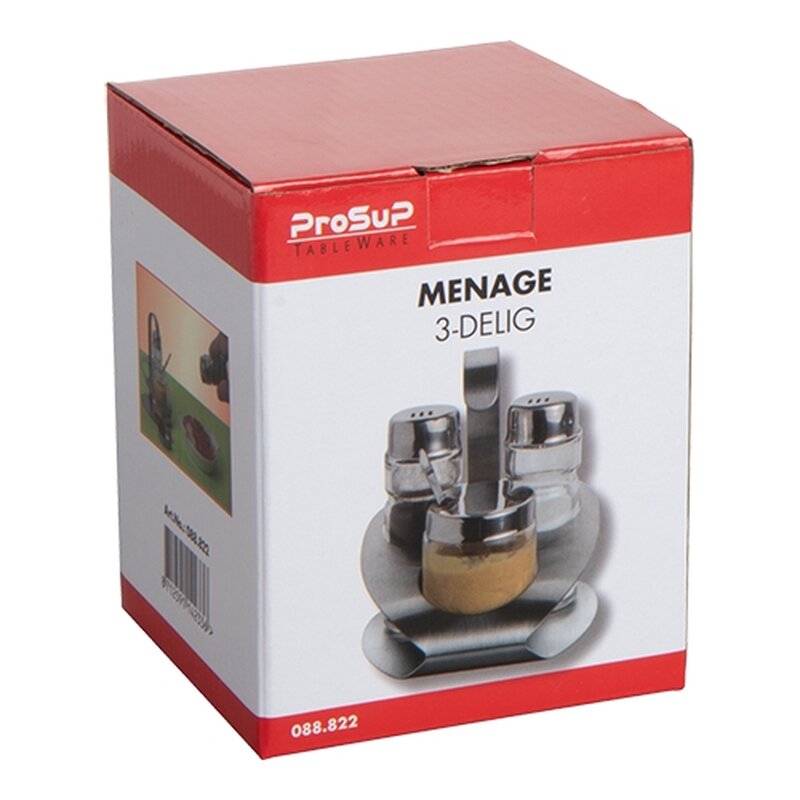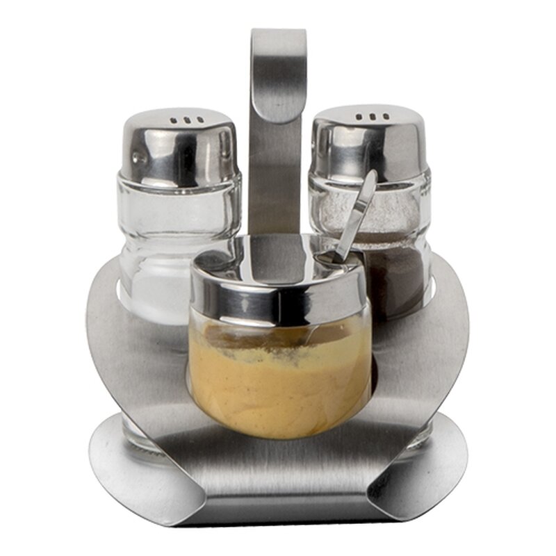 roestvrijstalen houder met peper- en zoutvaatje en mosterpotje