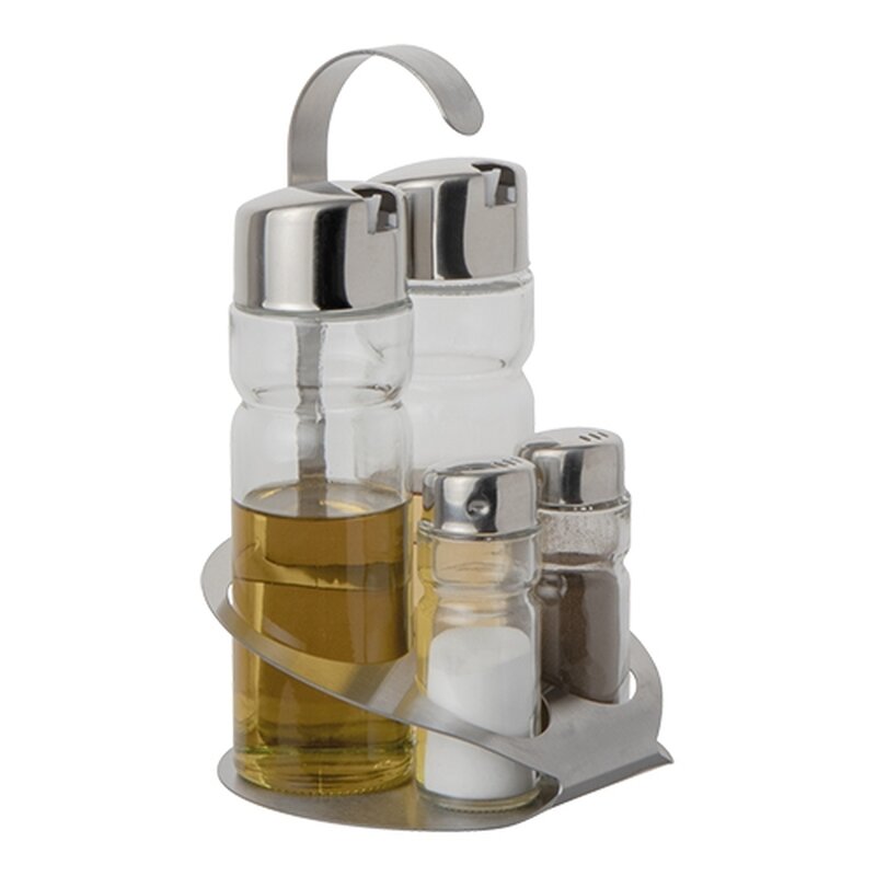 roestvrijstalen houder met peper- en zoutvaatje en olie- en azijnflesje