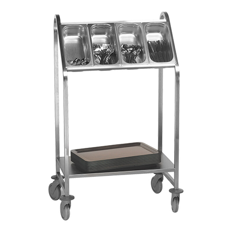 deze bestekuitgifte wagen biedt plaats aan maximaal 4x 1/3GN bakken en is tevens voorzien van een plateau voor bijvoorbeeld dienbladen, wordt zonder GN bakken geleverd