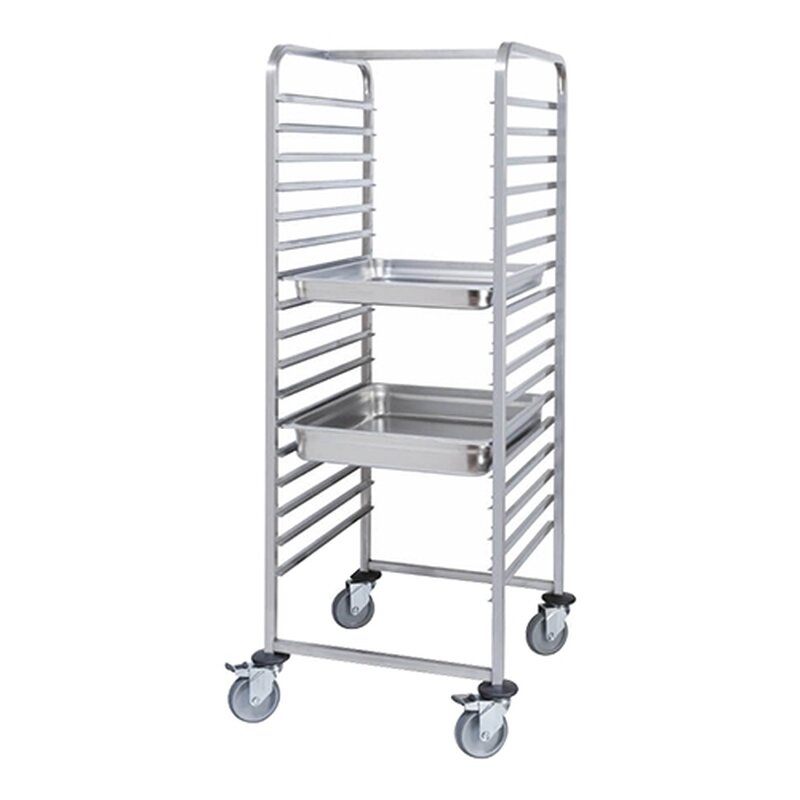 extra zware gelaste roestvrijstalen uitvoering met 17 regalen 2/1GN, voorzien van 4 zwenkwielen waarvan 2 geremd