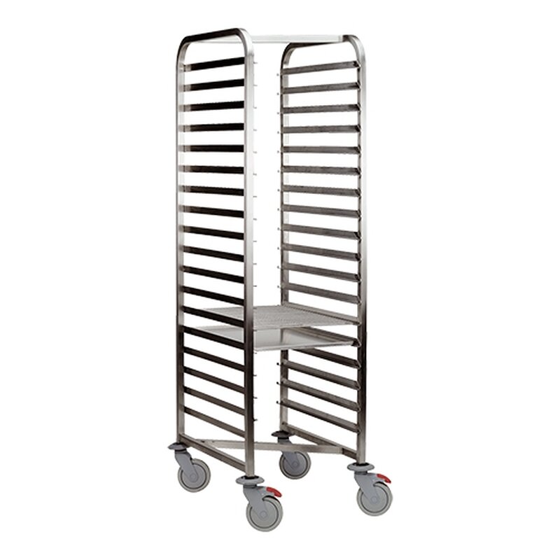 extra zware gelaste roestvrijstalen uitvoering Z model frame met 18 regalen bakerynorm, voorzien van 4 zwenkwielen waarvan 2 geremd, door het Z-vormige frame makkelijk in elkaar te schuiven en daardoor ruimtebesparend