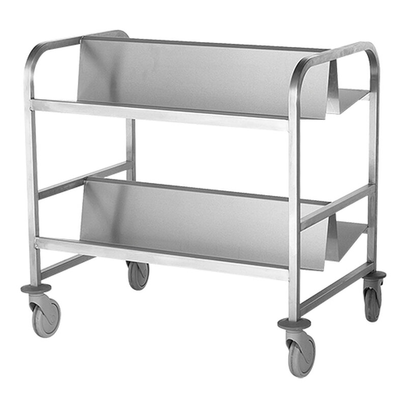 robuuste bordentransportwagen die is voorzien van 4 zwenkwielen, waarvan 2 geremd, met aan iedere zijde twee plateau's voor het vervoeren van borden