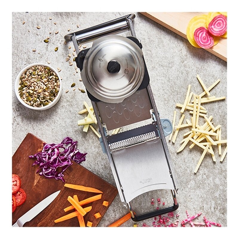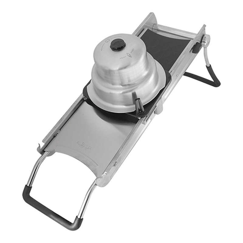 compleet roestvrijstaal, met speciaal bladensysteem voor het maken van blokjes, plakjesdikte instelbaar van 0mm tot 10mm, geleverd inclusief beschermslede en 3 Julienne meskammen