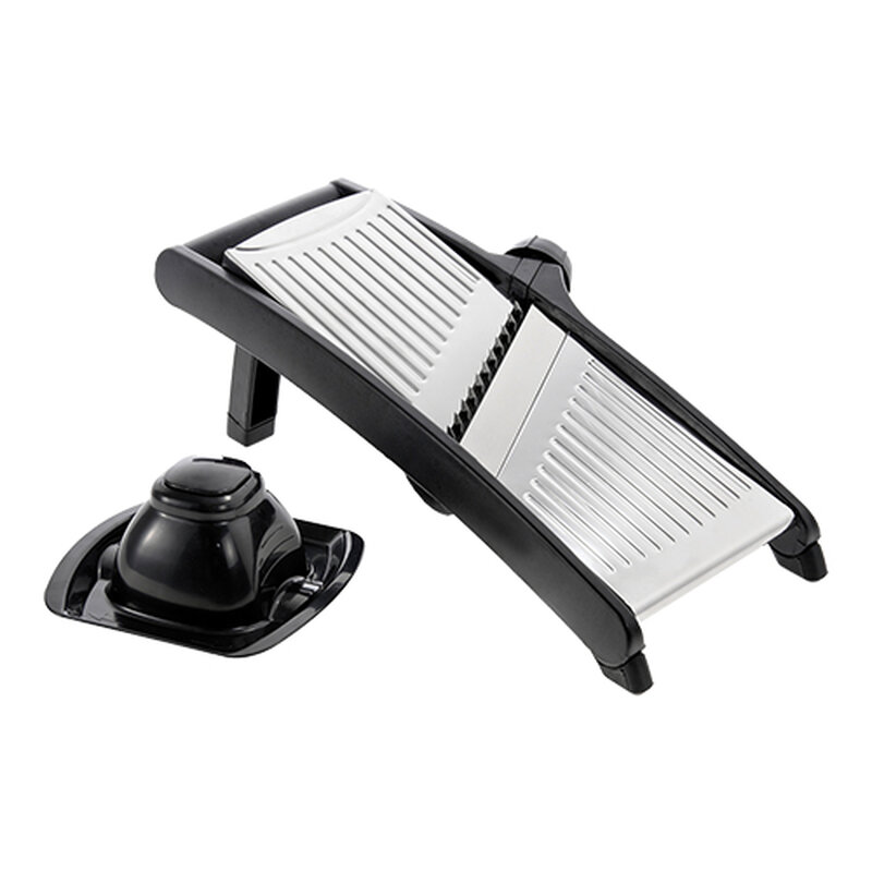 kunststof behuizing met roestvrijstaal snijvlak, inclusief beschermslede en geschikt voor plakjes en Julienne, dikte instelbaar tot 9 mm