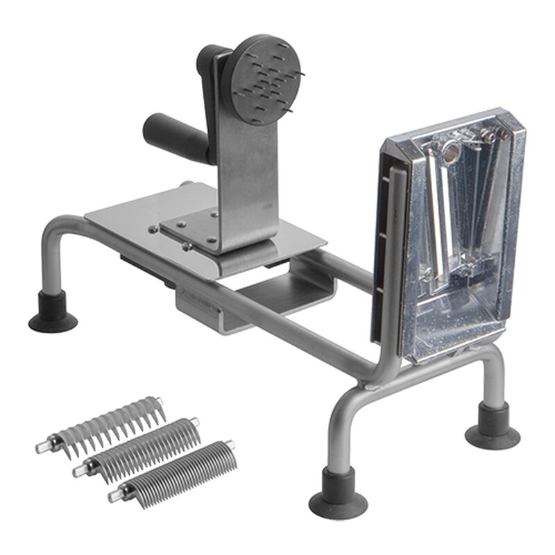 voor het maken van slierten of linten van bijvoorbeeld wortelen, aardappelen, uien, komkommer etc. voor salades en decoratie, wordt geleverd met 3 meskammen (2, 3 en 6 mm)