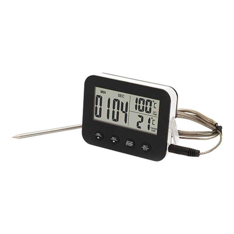 met magneetbevestiging en klapbare standaard, instelbaar temperatuur/tijd bereik en timer met waarschuwingssignaal en roestvrijstalen insteek voeler en draad